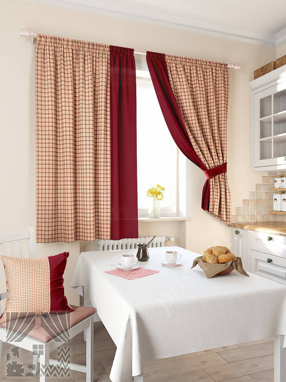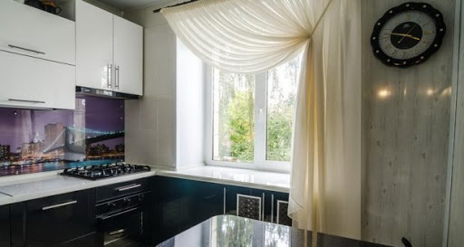 В первом случае нам помогут косые шторы. Занавески с неровным краем, то есть не по всей длине, создадут уют на кухне и не подвергнутся жировым брызгам.