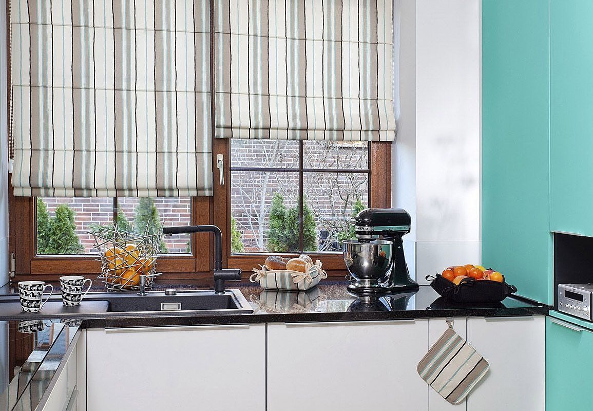 Второй способ - римские шторы. Подобные занавески стильно смотрятся на кухне и практичны в использовании. Их, возможно, сдвигать во время приготовления пищи и регулировать по своему усмотрению.