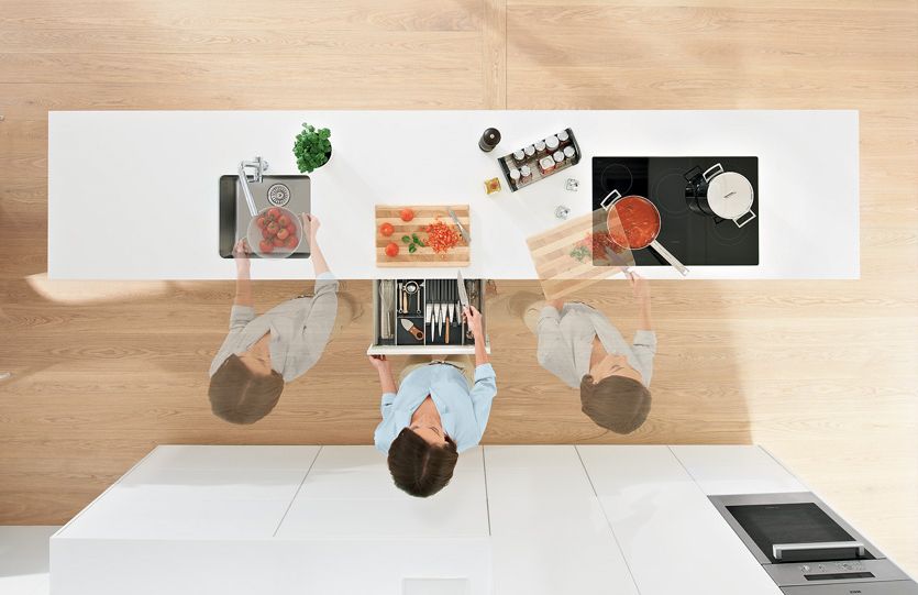 Представьте, Вы готовите на кухне и чтобы достать продукты из холодильника и помыть их или выкинуть упаковку, Вам приходится передвигаться вдоль всей кухни до мойки. А если Вы что-то забыли сразу достать из холодильника, то приходится повторять эти движения несколько раз.