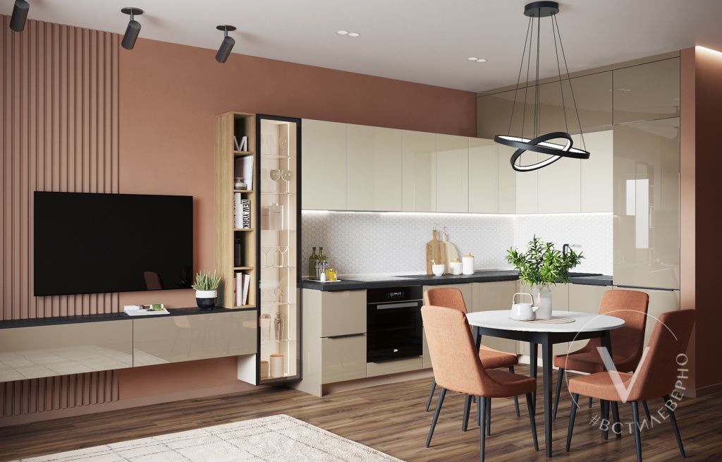 Яркое покрытие сразу привлекает внимание своим блеском, создавая ощущение праздника и поднимая настроение. Отражающие свет фасады визуально расширяют пространство и делают его светлее. Это прекрасный выбор для маленькой или темной кухни. Но в солнечном помещении глянцевый блеск может утомлять глаза. Серьезный минус глянца – на нем очень заметны любые загрязнения, но они легко удаляются. Глянцевые гарнитуры идеальны для современных стилей: хай-тек, ар-деко, минимализм.