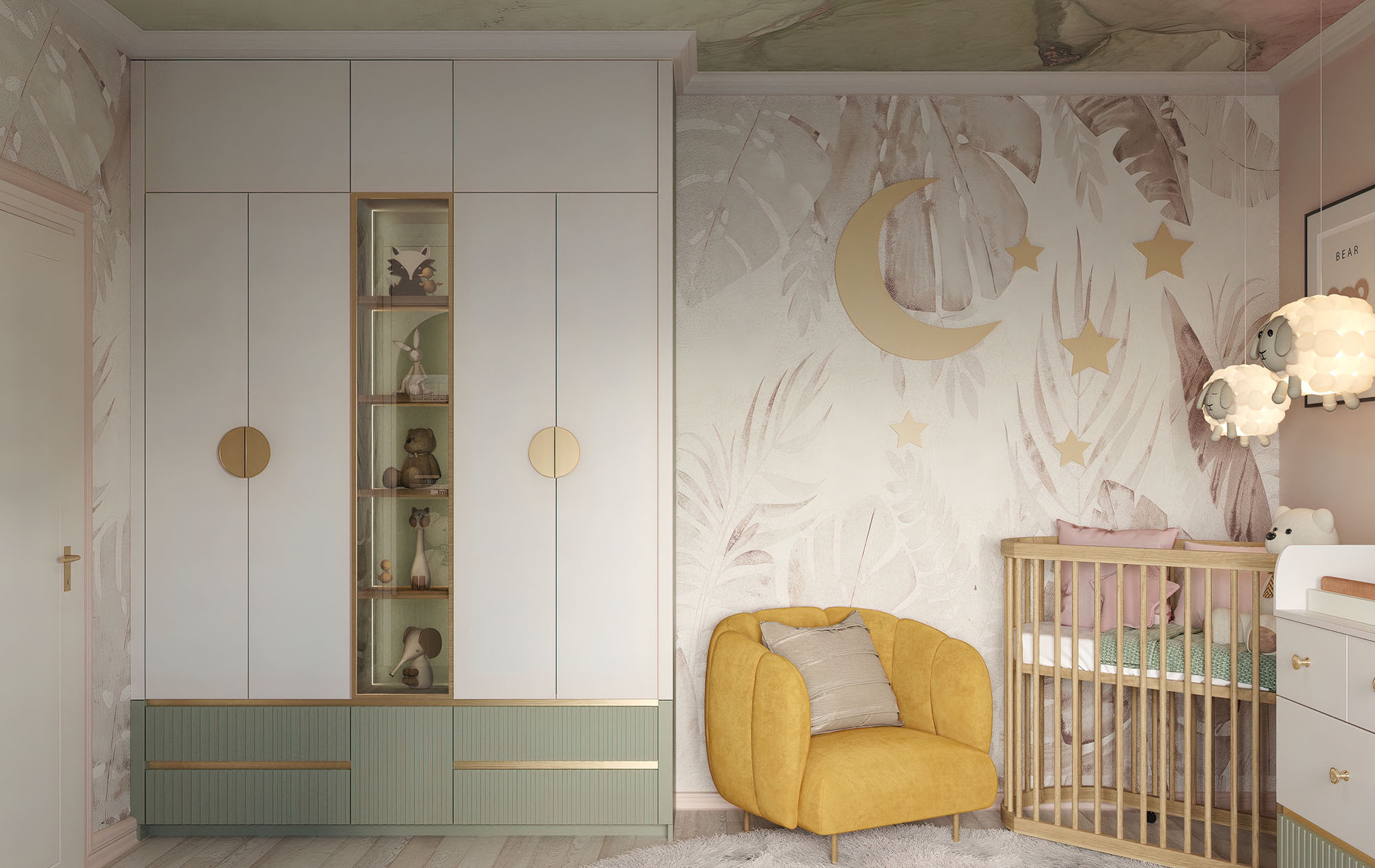 Центральная секция шкафа оставлена открытой — для игрушек. Это удобное и безопасное решение, которое позволяет ребёнку легко доносить до любимых игрушек и развивать навыки самостоятельности.